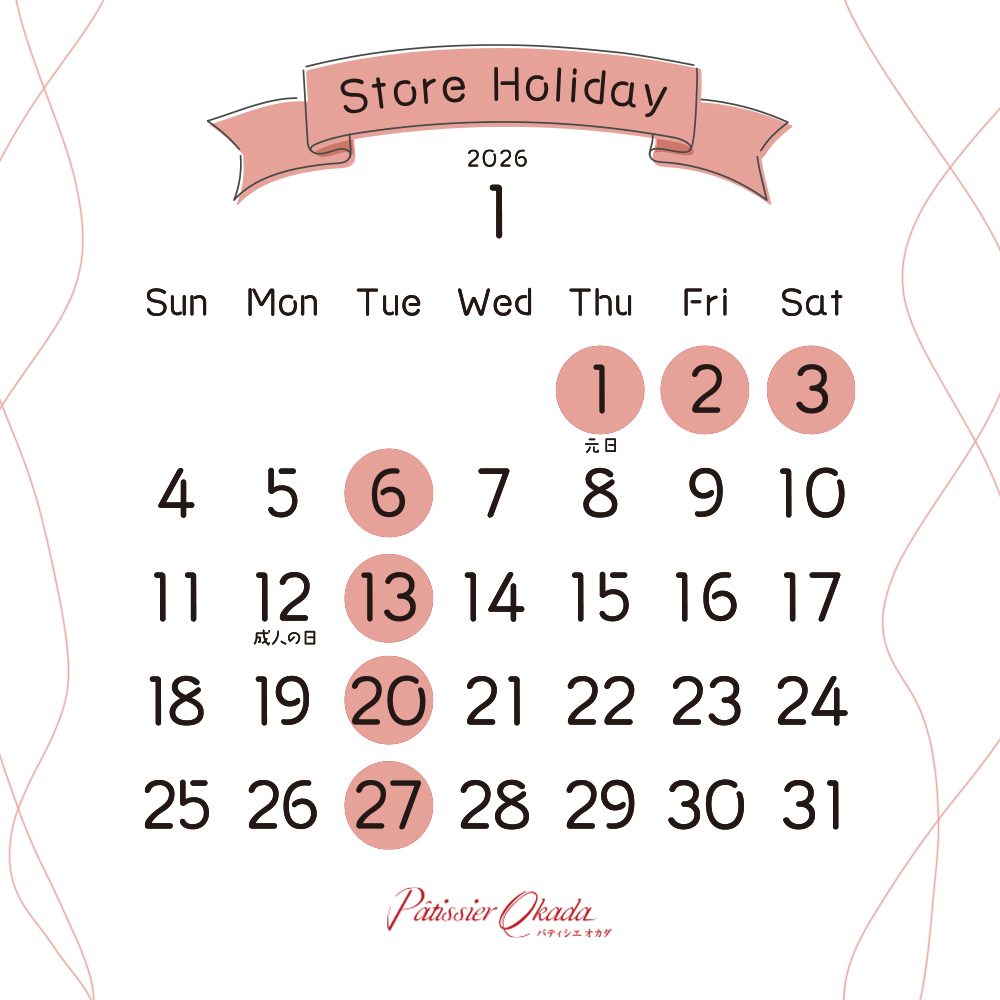 1月の店休日のご案内 2025.12.31 Post Share Hatena Pocket RSS Pin it feedly 記事のタイトルとURLをコピーする 年末年始 営業日のご案内 最新のお知らせ 2025.12.31 1月の店休日のご案内 2025.12.03 年末年始 営業日のご案内 2025.11.26 12月の店休日のご案内 2025.10.31 クリスマスケーキのご予約について 2025.10.21 11月の店休日のご案内 お知らせ一覧