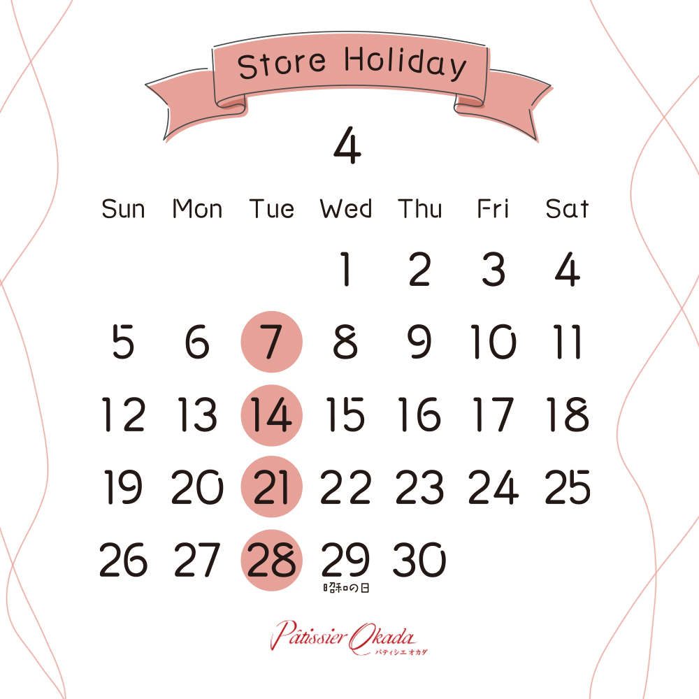 4月の店休日のご案内 2026.03.31 Post Share Hatena Pocket RSS Pin it feedly 記事のタイトルとURLをコピーする 3月の店休日のご案内 最新のお知らせ 2026.03.31 4月の店休日のご案内 2026.02.20 3月の店休日のご案内 2026.02.15 ひなまつりケーキのご予約承り中です! 2026.01.30 2月の店休日のご案内 2025.12.31 1月の店休日のご案内 お知らせ一覧