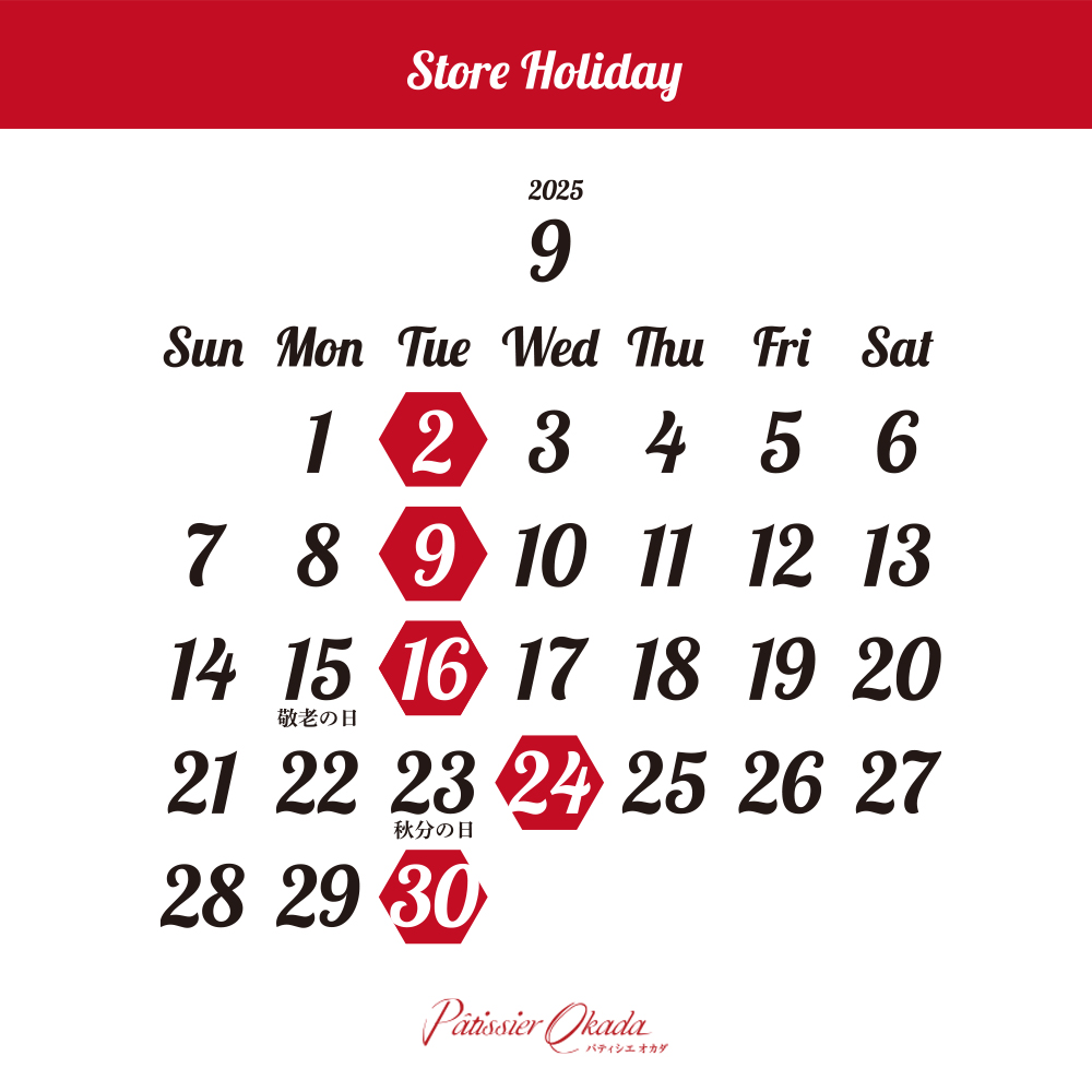 9月の店休日のご案内 2025.08.31 Post Share Hatena Pocket RSS Pin it feedly 記事のタイトルとURLをコピーする 8月の店休日のご案内 10月の店休日のご案内 最新のお知らせ 2026.02.20 3月の店休日のご案内 2026.02.15 ひなまつりケーキのご予約承り中です! 2026.01.30 2月の店休日のご案内 2025.12.31 1月の店休日のご案内 2025.12.03 年末年始 営業日のご案内 お知らせ一覧